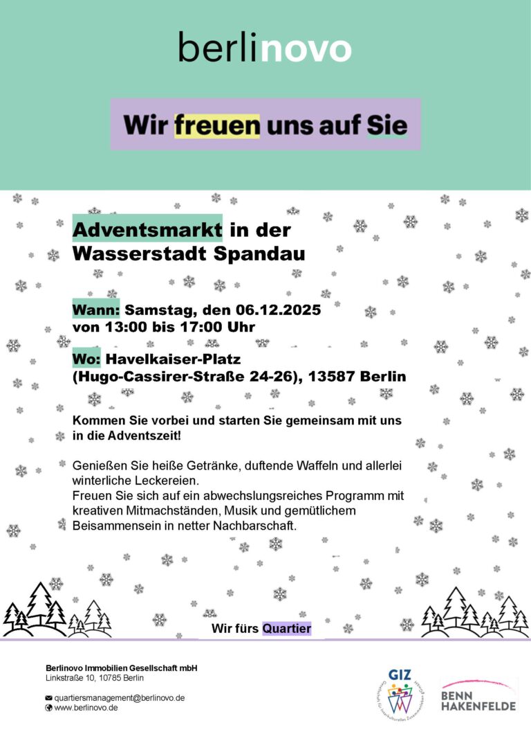 wir möchten euch herzlich zum Adventsmarkt von Berlinovo in der Wasserstadt Spandau einladen!